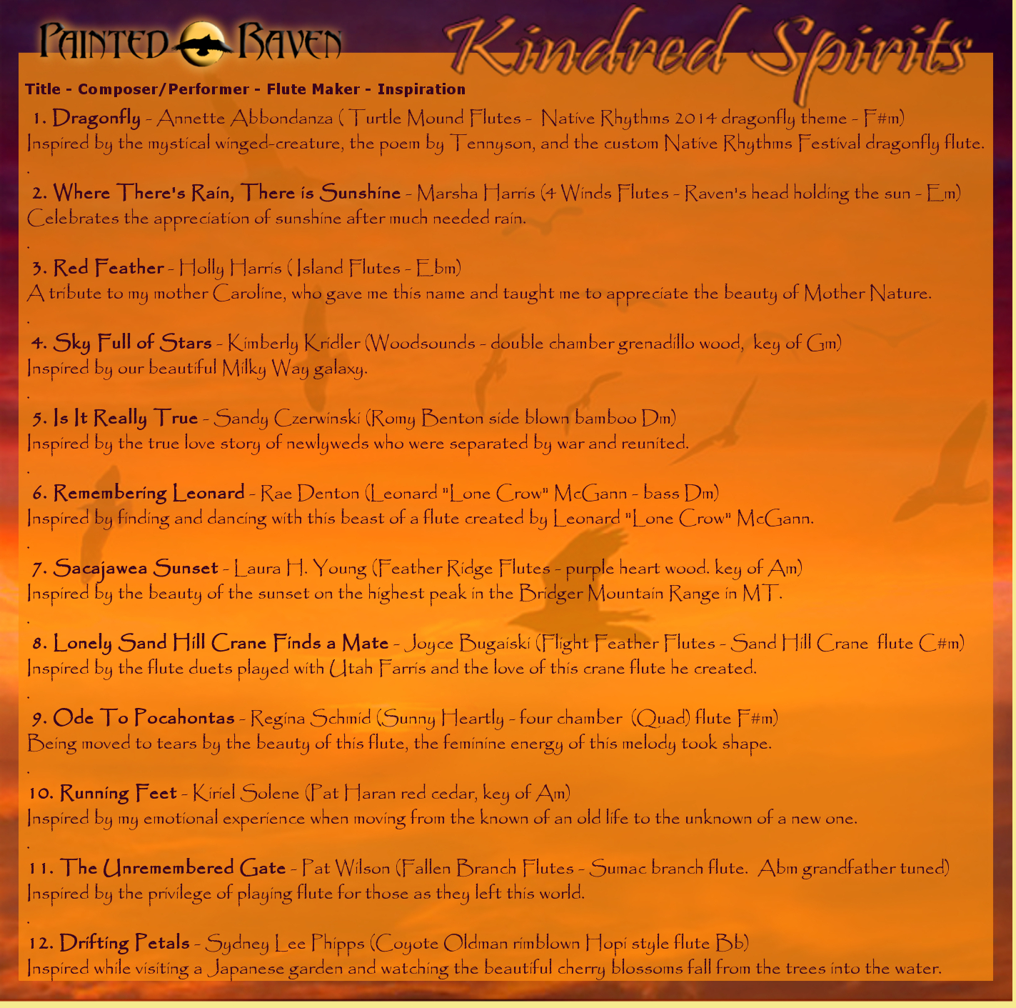 All of the women featured on this CD were competitors in the flute competition, except one was a competition judge. Some of them won first place, some won second and / or third place. Some became members of Painted Raven because of being recognized through this competition. All appeared on a Painted Raven CD because of this kinship. All became Kindred Spirits through this shared music project.